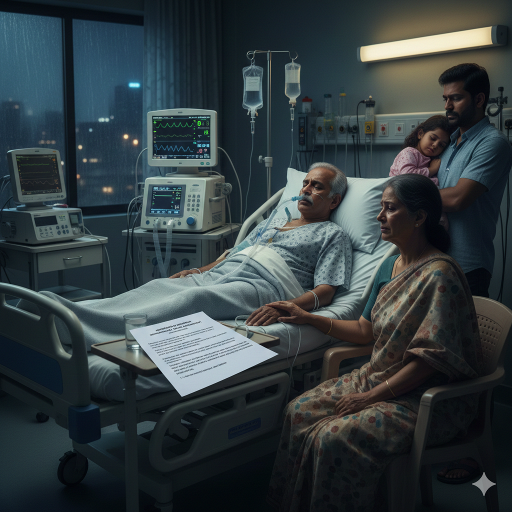 Ragesh remained silent. He had the ‘Living Will’ (Advance Medical Directive) that Raghavan had prepared, stating clearly that he did not want ventilator support. But Ragesh feared that if he produced it now, the family would hate him. He feared being labeled “the one who let his father-in-law die.” Love often forces us to hide the truth.